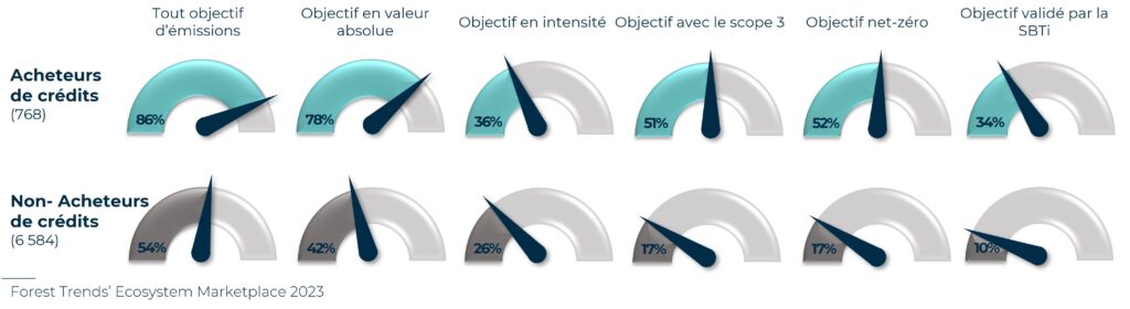 Les acheteurs de crédits carbone sont plus susceptibles d’avoir des objectifs liés au changement climatique, et ces objectifs sont plus ambitieux. Les acheteurs de crédits carbone ont au moins un objectif absolu, et 52% des acheteurs de crédits carbone ont un objectif de neutralité carbone. Ils sont également 3 fois plus susceptibles d’inclure les émissions de gaz à effet de serre de leur scope 3 dans ces objectifs.