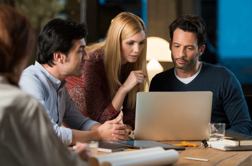 Team di persone lavorano insieme in ufficio davanti a un laptop. Crediti d’imposta Transizione 4.0