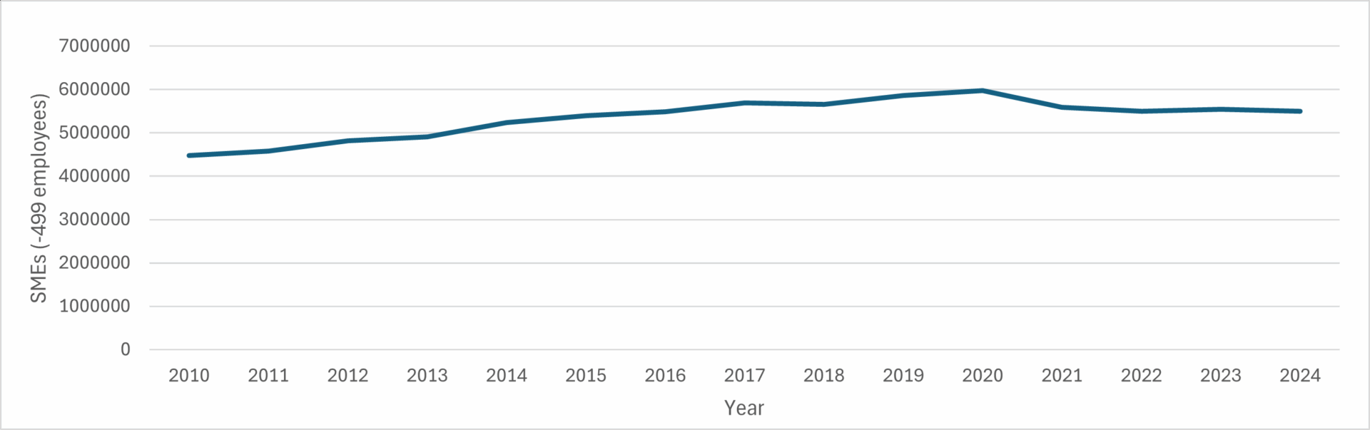 For nearly twenty years, there was sustained growth in the number of S in the private sector with 0-499 employees; however, according to the latest HMRC data, the number of these SMEs declined from 2021 to 2022, from 5.59 million to 5.51 million, with brief growth in 2023 up to 5.55 million, before declining again in 2024 to 5.50 million.